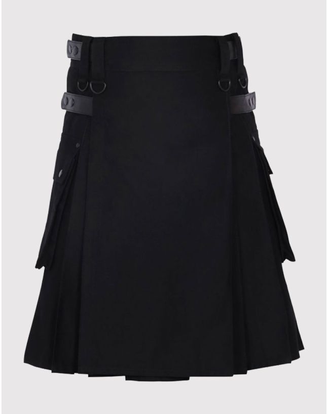 Leather Straps Black Cotton Utility Kilt