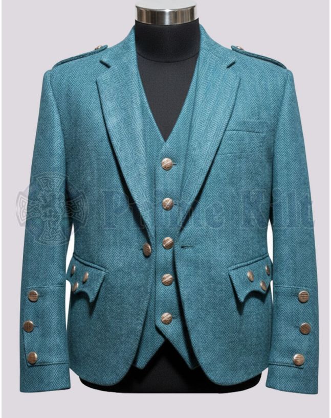 Lovat Blue Tweed Kilt Jacket and waistcoat set brings classic Scottish style to any event. Made from soft, pure wool, this smart jacket features silver-tone buttons and a tailored fit. Perfect for weddings, ceilidhs, or honoring your heritage.