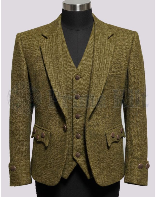 Tweed Kilt Jacket and Waistcoat Gold blends classic Scottish style with modern comfort. The gold tweed shines subtly, while the tailored fit and silver buttons make it perfect for weddings, Highland games, or any special event.